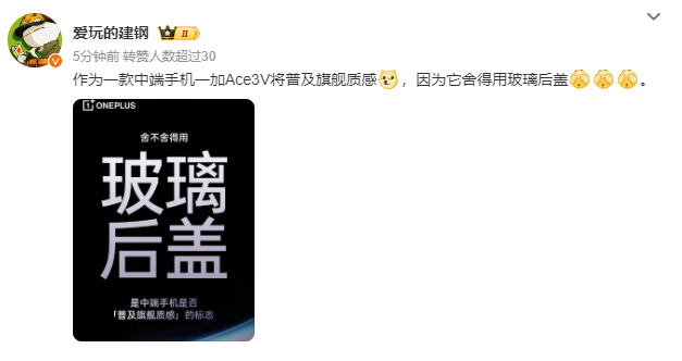 对于一加Ace3V旗舰质感,就有博主表示是因为它舍得用玻璃后盖,确实玻璃后盖的成本比起金属要贵,在薄利多销的中端机型自然是十分少见。