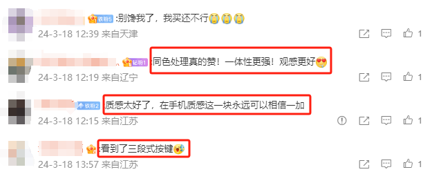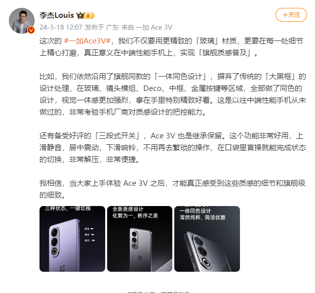 在一加总裁李杰的最新微博下,不少朋友都对一加Ace3V的质感表示认可,今年一加Ace3V在外观上就直接沿用旗舰质感,采用「一体同色设计」,使得整机在颜色上整齐统一,同时机身上又含有玻璃、金属等不同材质混合,哪怕仅有一种颜色情况下,整体质感也豪不缺失,值得一提的是,今年一加Ace3V还将搭保留「三段式开关」,上滑静音,居中震动,下滑响铃,盲操也能完成切换,非常便携解压。