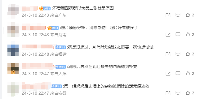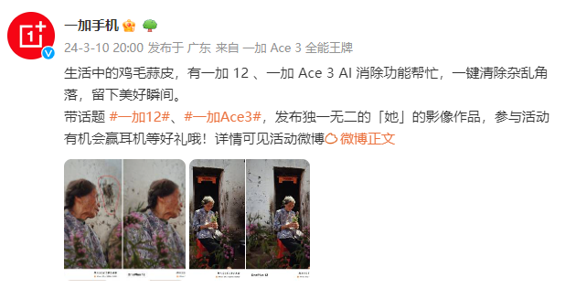 当然除了这些以外,一加Ace3V还兼具着一个使命「普及AI」,作为旗舰级别才普及的功能,如今下放到中端机型,自然是关注点十足,对于官方展示一加Ace3V的AI消除功能,不少用户表示AI消除确实很厉害,消除后好看很多,甚至有用户还觉得消除后的才是原图,一加Ace3V在AI方面确实可以好好期待一下。