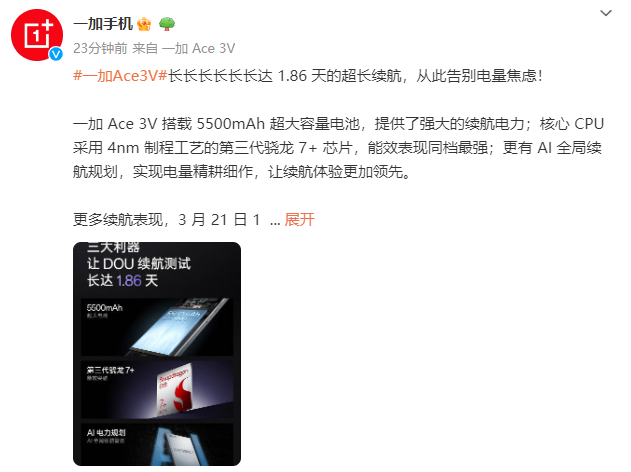 这样来看,一加说要挑战「 中端手机八冠王 」还真不是开玩笑,一加Ace3V外观跟旗舰看齐,能效方面比起骁龙8Gen2还要强,并且在续航表现上也达到了1.86天的惊人成绩,同时还有AI功能搭载,可以是一加Ace3V对于游戏党、长续航党来说都是很友好的,同时V系列售价一直都很亲民,感觉一加Ace3V在定价上也有着不小惊喜,大家感兴趣的话,就不容错过3月21日的一加Ace3V发布会了。