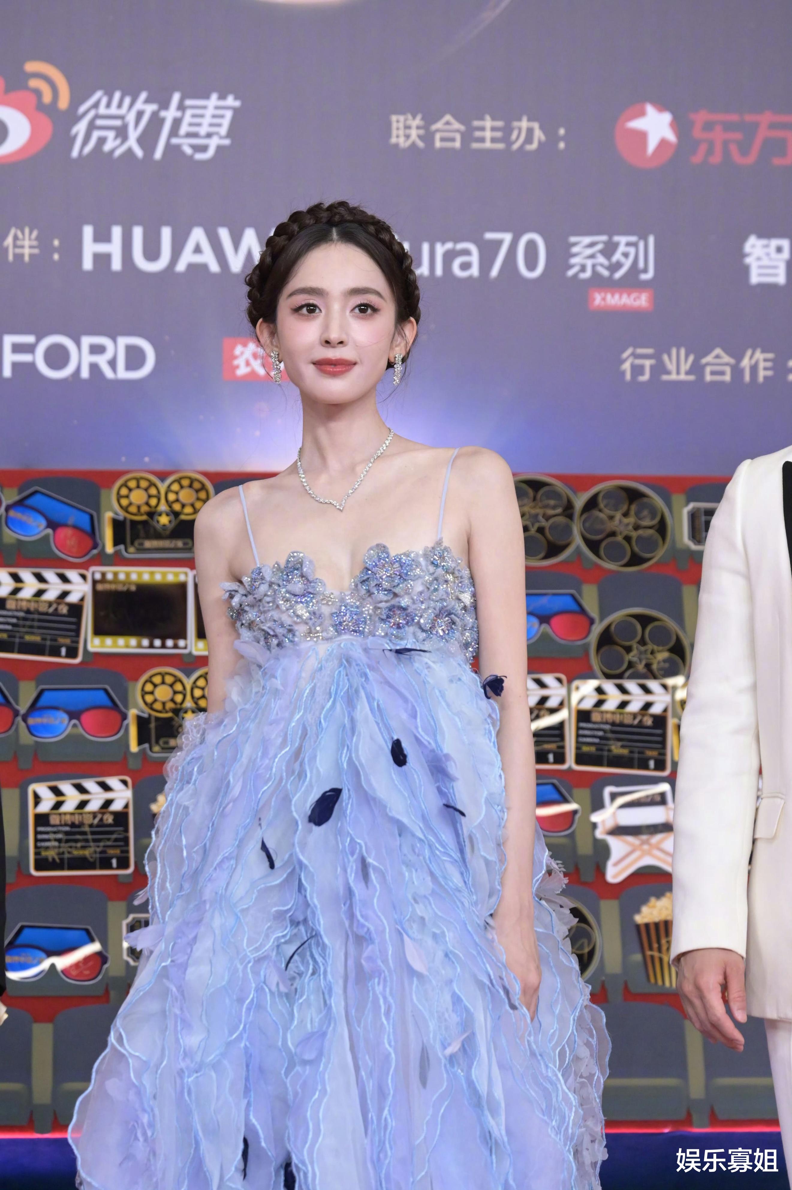 现场的人看到娜扎,大家都忍不住惊叹娜扎的美貌,蛙声一片。娜扎第二套造型也好好看,也是花仙子呢,雾蓝吊带礼服,黑羽毛点缀,梦幻又优雅。真·脸在江山在!