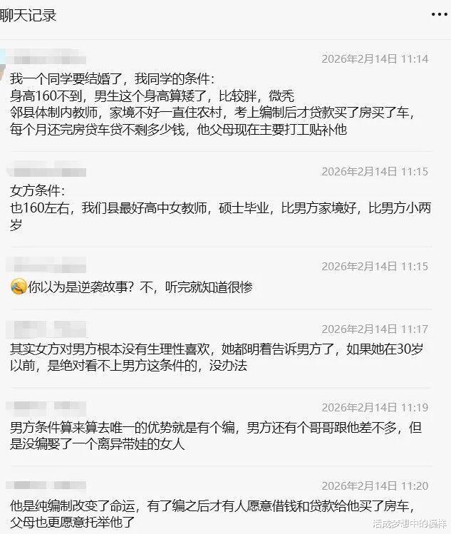 1、男方自身外形、能力和积蓄都很一般甚至偏下,家境也比较差,好不容易考上编才改变了命运,否则大概率不如起初有父母帮衬的他哥,可即便现在考上了编现在因为房贷车贷也存不下什么钱,需要靠父母打工支持。