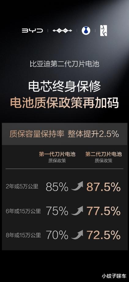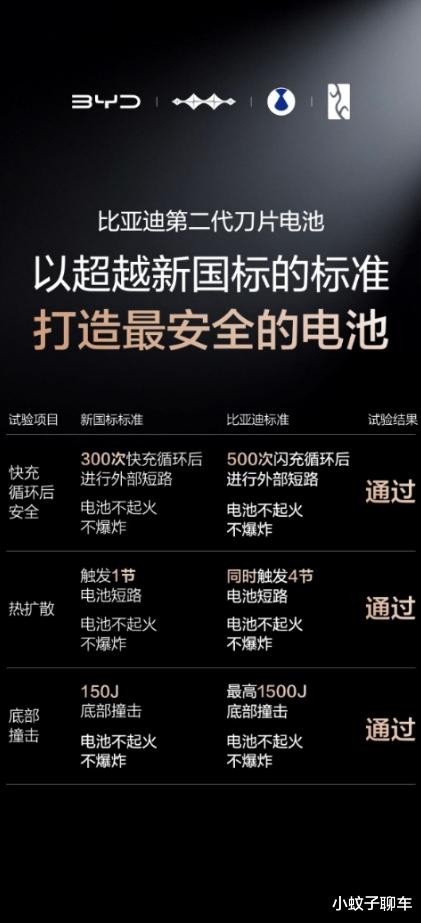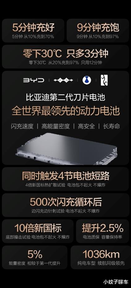 不仅如此,第二代刀片电池还成功挑战了全球唯一「边闪充 边针刺」试验,以超新国标难度的「热扩散」试验和超大能量「底部撞击」试验,均做到不起火、不爆炸,并且在使用寿命方面,在延续第一代刀片电池电芯终身保修的同时,电池质保容量保持率整体提升2.5%。