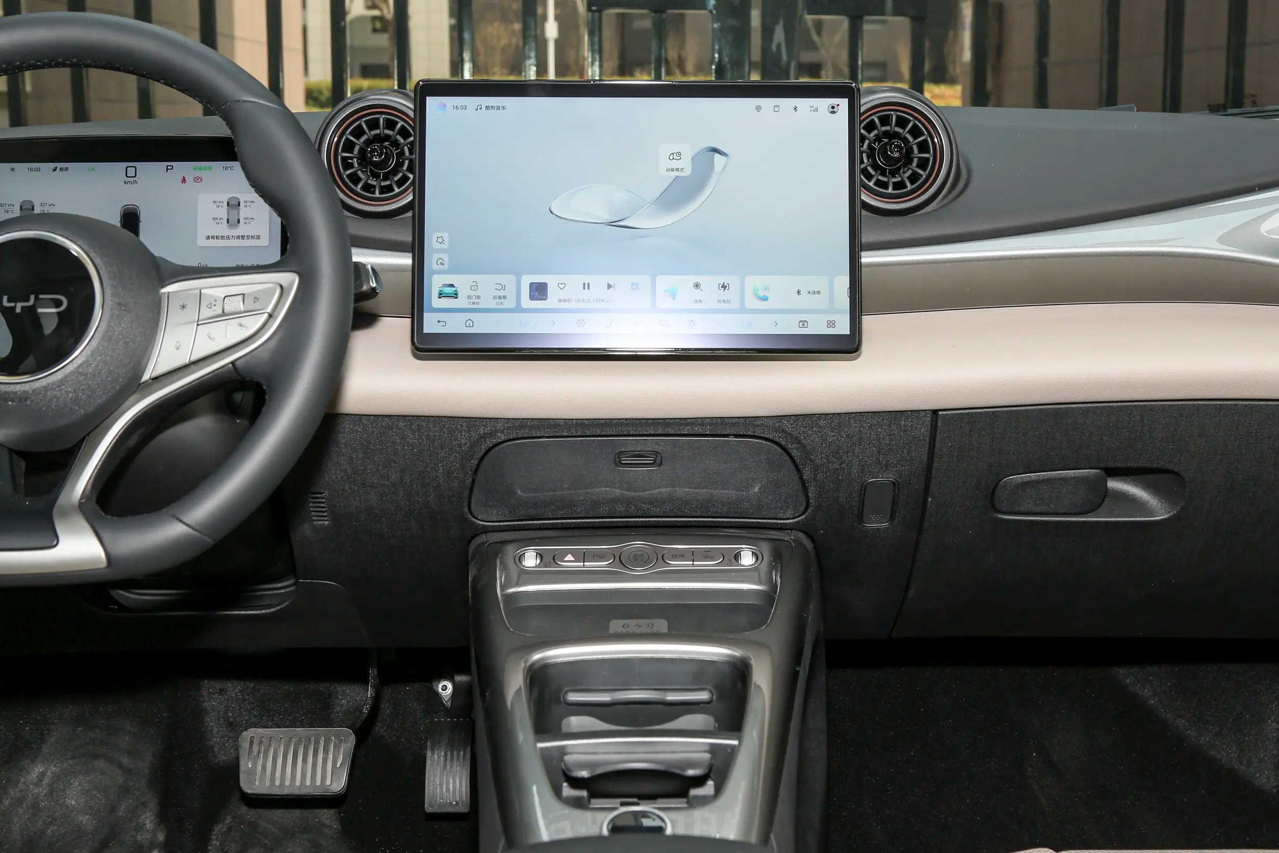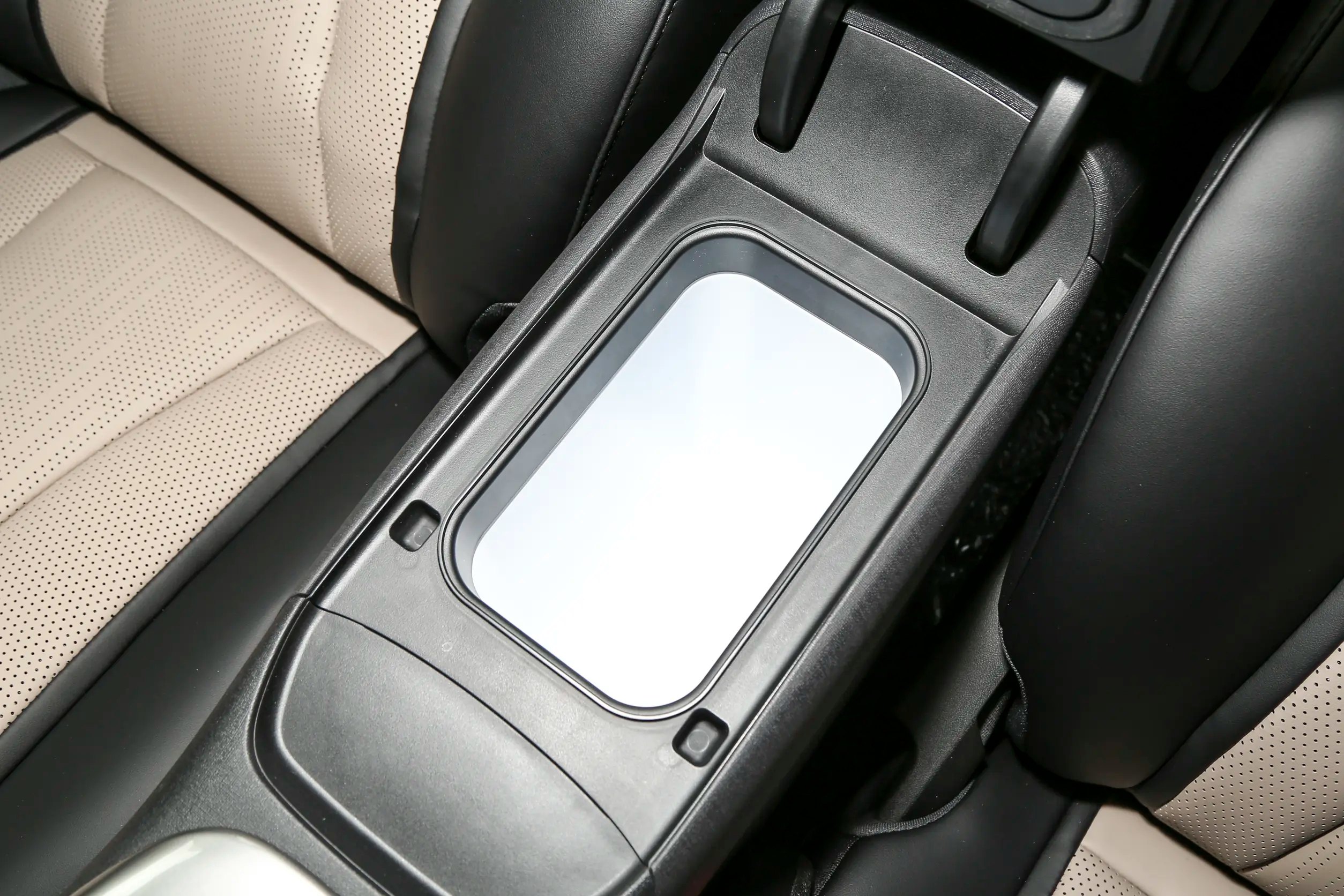 中控台布局:三幅式平底方向盘、电子怀挡换挡机构、8.8英寸英寸液晶仪表、12.8英寸悬浮式中控屏。同时,前中央扶手台还进行了镂空式设计,上方为实体空调按键、50W手机无线充电面板、水杯架;下方为开放式储物槽。