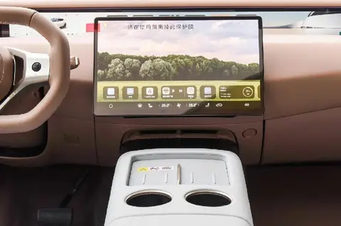 进入车内,我们能够明显感觉到车内设计的高品质与科技感,特别中控台的配置显得十分大气和富有科技感。它采用了大面积的软质材料覆盖,搭配精致的缝线工艺,摸起来特别舒服。中控台采用分层的设计理念,上方为35.4英寸的全液晶的仪表盘,这个仪表盘的分辨率已经达到了4K,显示效果极为细腻,下方则是15.6英寸的悬浮式中控屏,操作流畅且界面友好。这个车的方向盘采用了平底设计的三辐式多功能方向盘设计,整个方向盘的握感十分舒服,而且集成了多项实用功能,如语音控制、定速巡航等,极大地方便了驾驶者的操控。而且这个方向盘还支持电动调节,可以根据驾驶者的喜好和坐姿自动调整角度,同时还拥有加热和记忆功能,确保在寒冷季节也能提供舒适的驾驶体验。而车辆的换挡形式则是采用了电子式换挡设计,这样操作起来会更加简单,而且节省了中控台空间,使得整体布局更加简洁,中台位置配备一块无线电充电面板,可以同时为两块不同的移动设备进行充电。