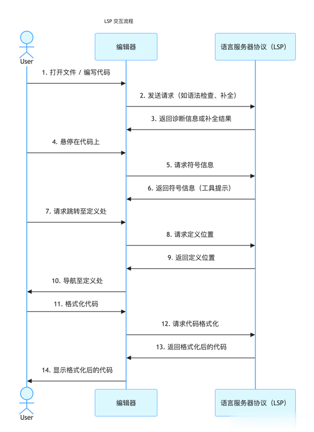 智能代码补全(Code Completion)悬停文档(Hover Documentation)定义跳转(Go to Definition)引用查找(Find All References)符号搜索(Symbol Search)代码格式化(Formatting)重构支持(Refactoring)1.2 LSP工作原理架构LSP采用客户端-服务器架构模式: