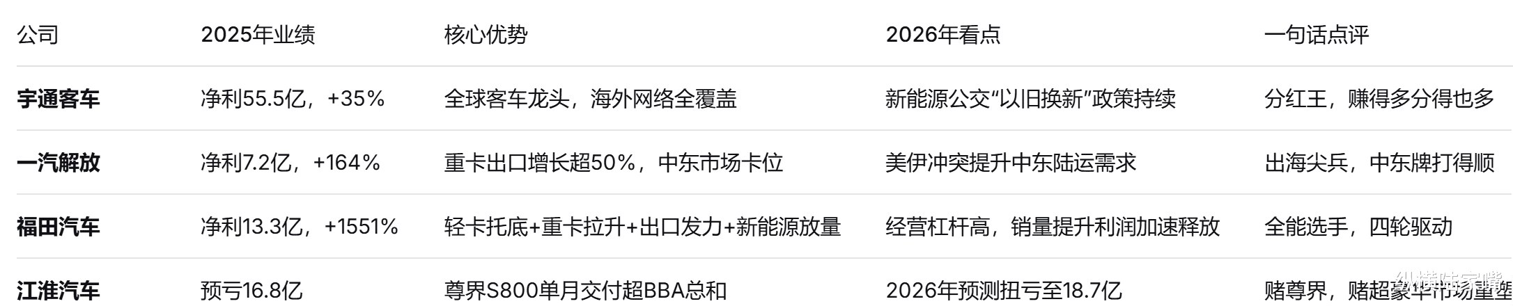 2026年是“十五五”开局之年。四家公司,四本账,四种活法。宇通的稳、解放的快、福田的全、江淮的赌——谁能在这一轮洗牌中拿到船票?