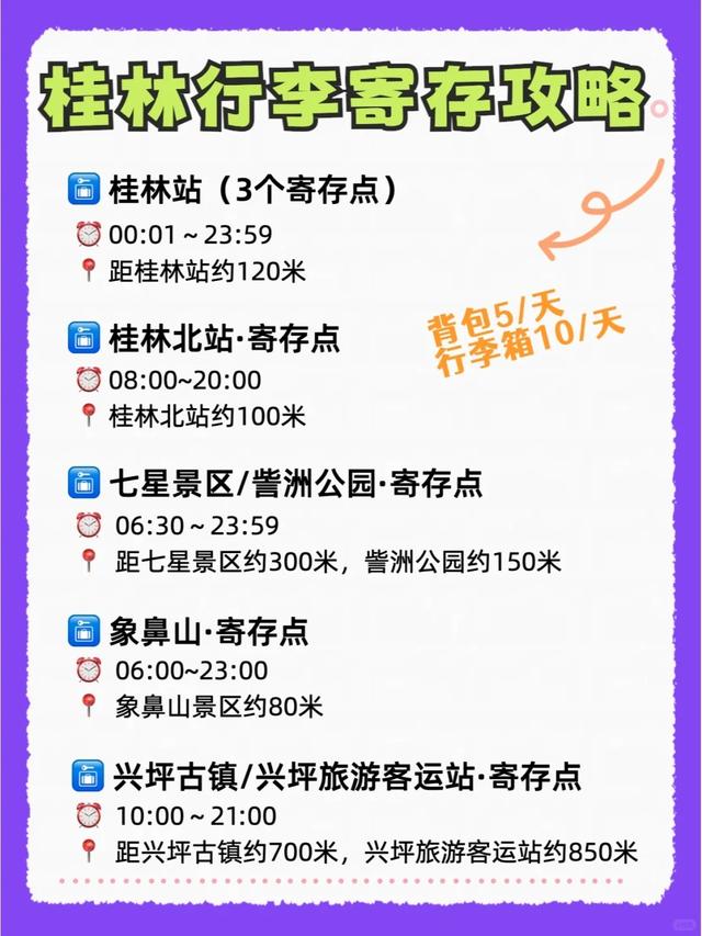❇️桂林站(3个寄存点) ⏰00:01~23:59 距桂林站约120米 ❇️桂林北站·寄存点 ⏰08:00~20:00 桂林北站约100米 ❇️七星景区/訾洲公园·寄存点 ⏰06:30~23:59 距七星景区约300米,訾洲公园约150米 ❇️象鼻山·寄存点 ⏰06:00~23:00 象鼻山景区约80米 ❇️兴坪古镇/兴坪旅游客运站·寄存点 ⏰10:00~21:00 距兴坪古镇约700米,兴坪旅游客运站约850米