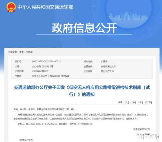 2026年2月28日,交通运输部办公厅正式印发《低空无人机应用公路桥梁巡检技术指南(试行)》(以下简称《指南》)。这份重磅文件的发布,标志着无人机桥梁巡检从“单点探索”迈入“规范引领”的新阶段。