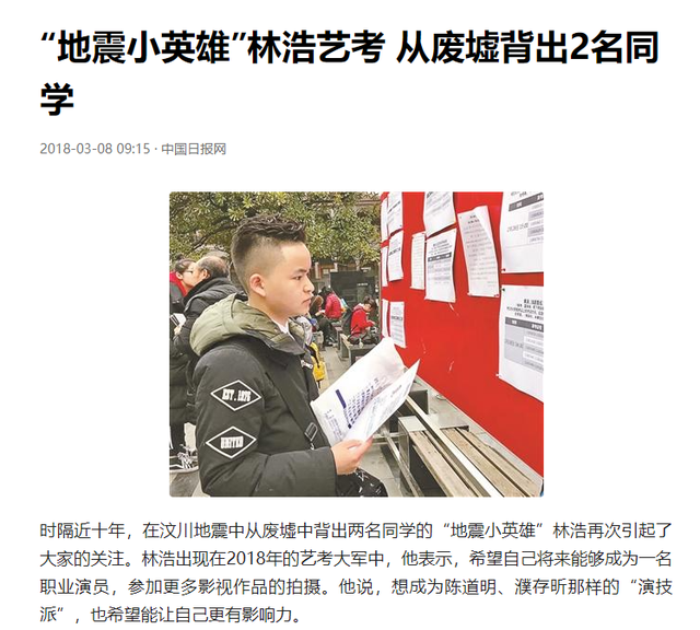 中国日报——“地震小英雄”林浩艺考 从废墟背出2名同学