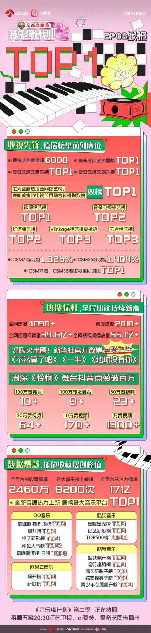 节目播出后,台网“成绩单”依旧抢眼。节目收视CSM71城1.326%,CSM35城1.404%,居省级卫视同时段Top1。在各大社交平台,揽获全网热搜4090+,其中微博热搜2010+个,全网话题阅读量突破39.6亿+,短视频播放量达55.1亿+。节目歌曲在各大音乐平台收藏量累计突破2460万,总热力值超17亿,总上榜量达8200次,霸榜QQ音乐、酷狗音乐、网易云音乐、酷我音乐等各大音乐平台Top1。