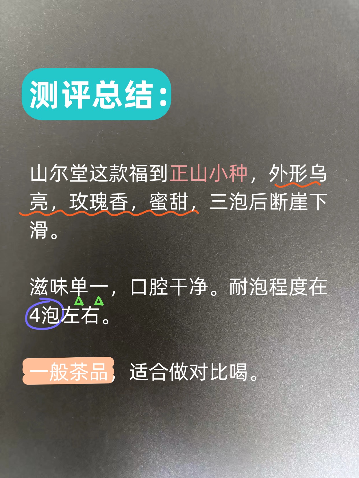 山尔堂这款福到正山小种,外形乌亮,玫瑰香,蜜甜,三泡后断崖下滑。滋味单一,口腔干净。耐泡程度在4泡左右。一般茶品,适合做对比喝。