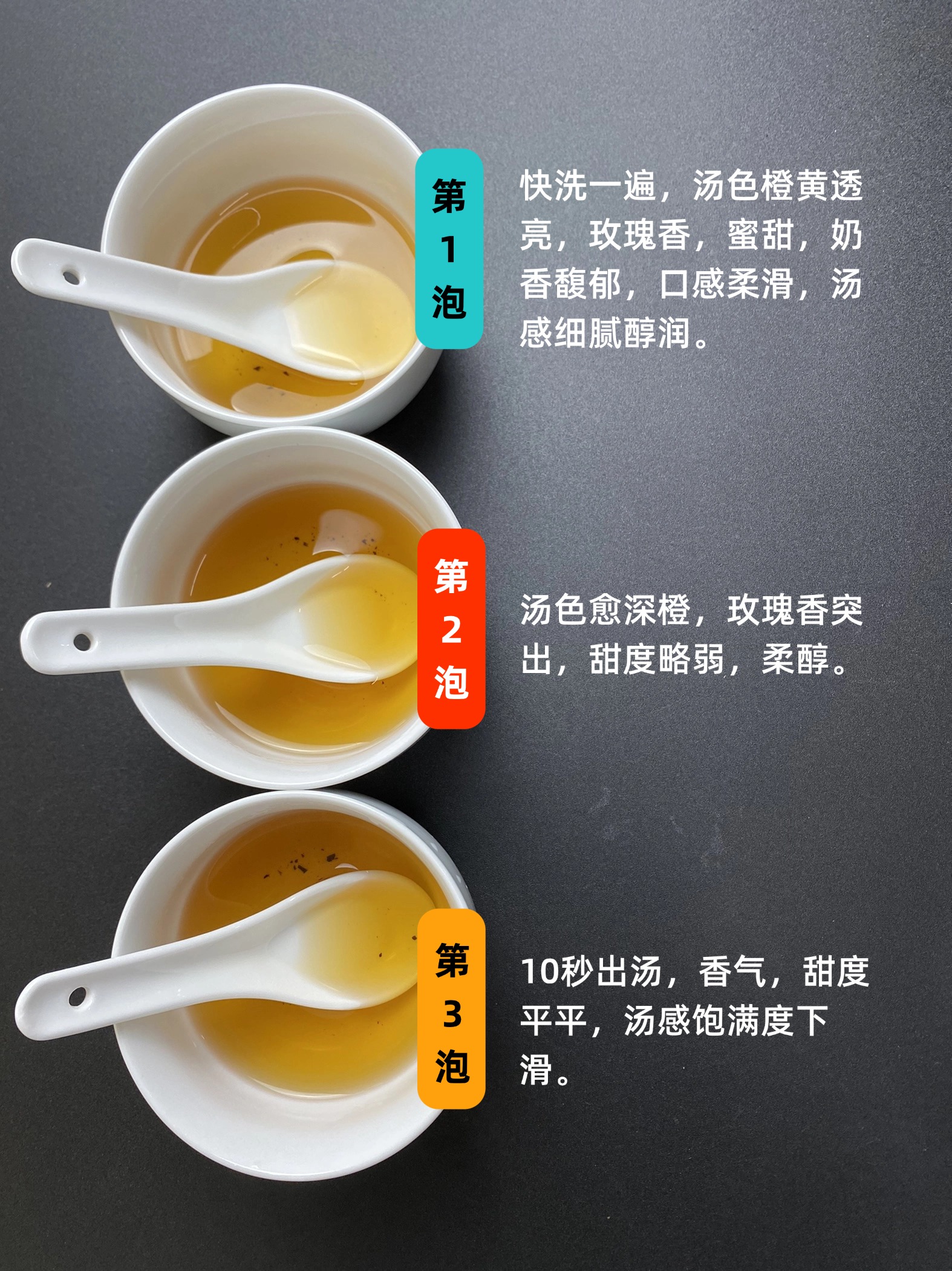 第一泡,快洗一遍,汤色橙黄透亮,玫瑰香,蜜甜,奶香馥郁,口感柔滑,汤感细腻醇润。