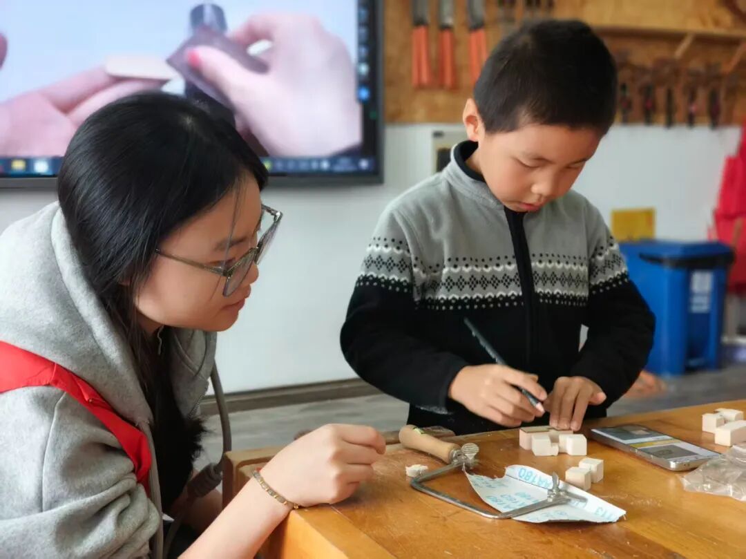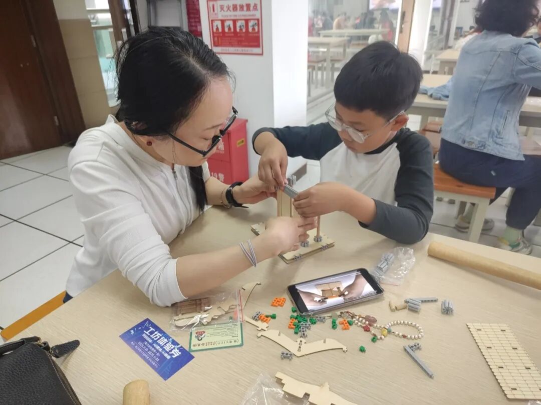 在工坊体验区,同学们在老师的指导下,利用指定器材与工具,进行“垂花门”、“汉阙”的搭建涂装,“平衡鹰”、“木构桥”的拼装组合,“鲁班木”、“竹蜻蜓”的加工制作,探究其中的科学奥秘、工匠精神和建筑文化,培养动手实践能力与工程启蒙思维。