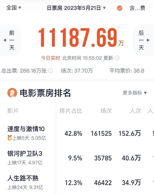 IP竞争力直接体现在排片上。《速10》520当天的票房收益比《人生路不熟》《请别相信她》加起来还要多,根据灯塔专业版,《速10》上映首日排片达到了52%,520和521当日排片占比都在40%以上。