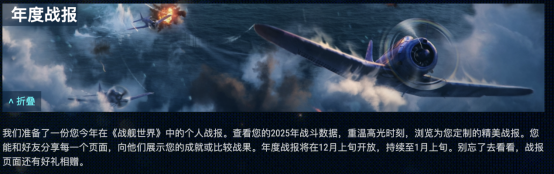 时间过得真快,2025年还剩下最后几天就要结束了,舰长们可以查看自己的年度战报,探索作为舰长在2025年的战绩,与好友一起分享胜利的喜悦同时,同样也有好礼相赠。