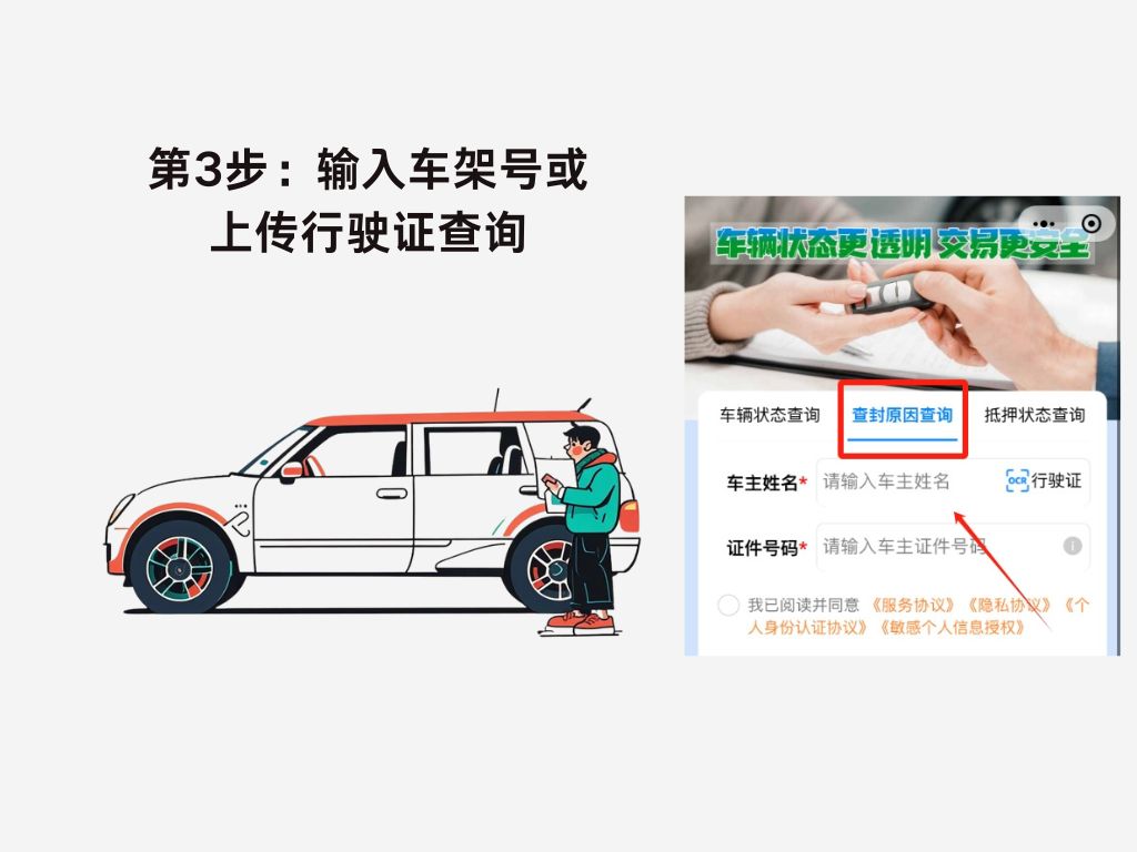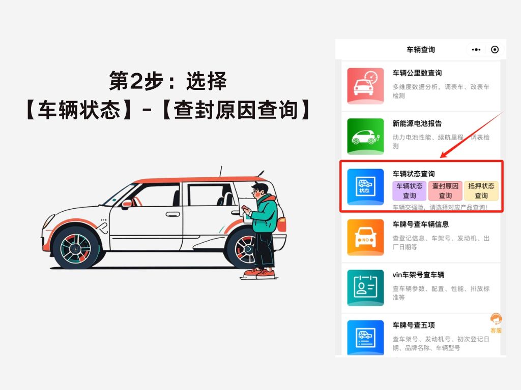 比如,打开微-信,在上面的搜索框输入:品车教官,进入小程-序或公众-号,找到:【车辆状态查询】中的【查封原因查询】,输入车架号或上传行驶证照片,查看车辆查封公告。
