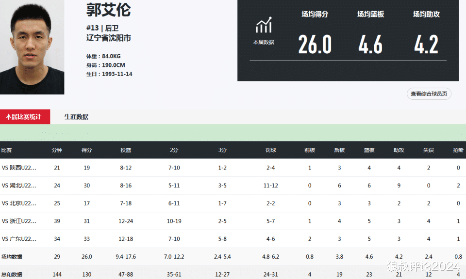 郭艾伦在上一届的全运会的表现非常出众,场均登场29分钟,得到26分4.6篮板4.2助攻,并不是很擅长的三分球投篮命中率都可以场均投中2.4个。