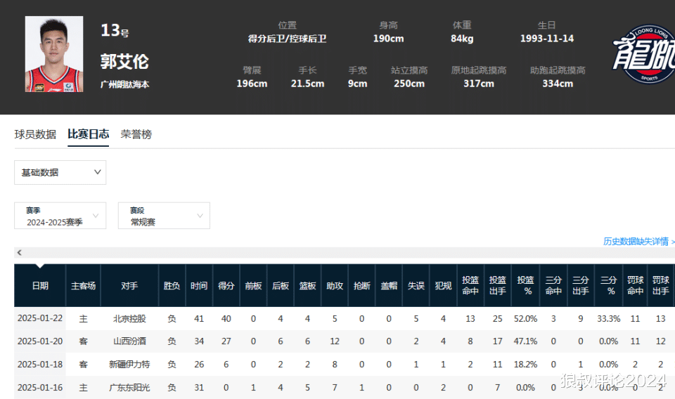 不过32岁的郭艾伦上一场正式比赛还要追溯到2025年的1月22日,广州龙狮不敌北控男篮,郭艾伦登场41分钟,25中13,得到40分4篮板5助攻。