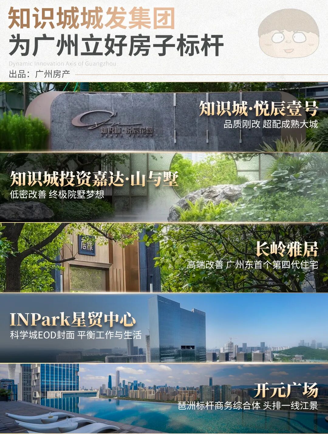 知识城·悦辰壹号定位品质刚改,长岭雅居定义高端改善,知识城投资嘉达·山与墅满足终极院墅梦想,INPark星贸中心与开元广场,定位城市综合体。