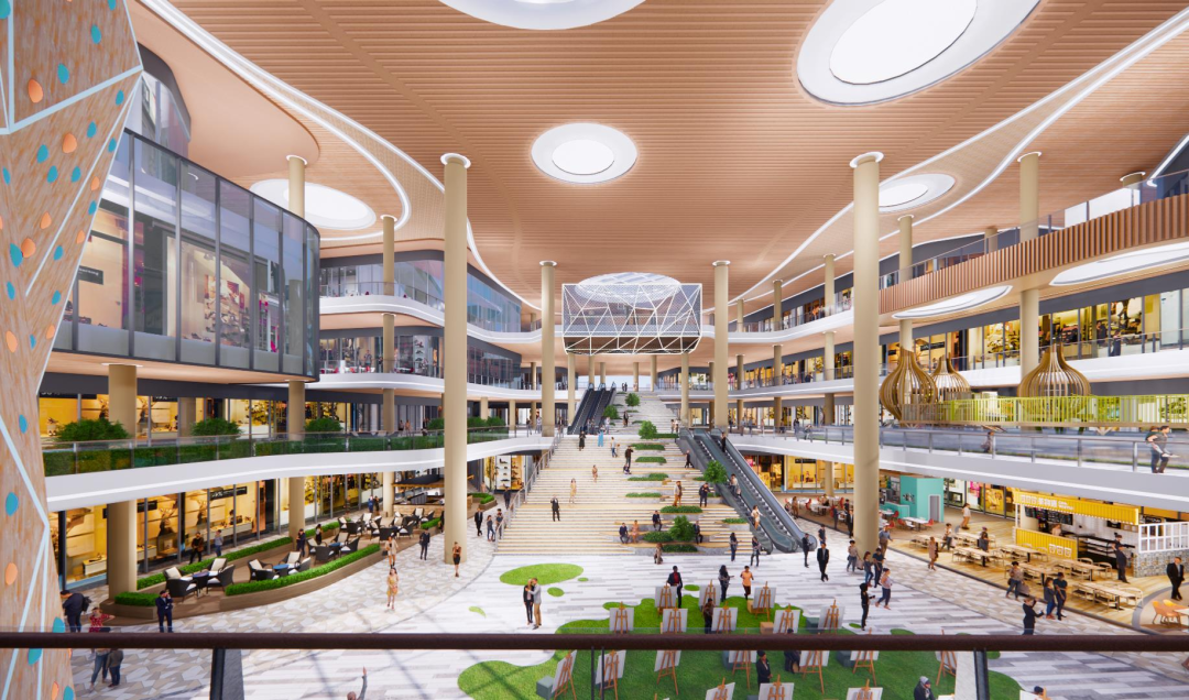 它以生态公园+连绵山景为生态底盘,内部借由抬高(最高)18米设计与围合式布局,营造出约2.3万㎡的完整中心立体园林,相当于3.2个标准足球场的大小。