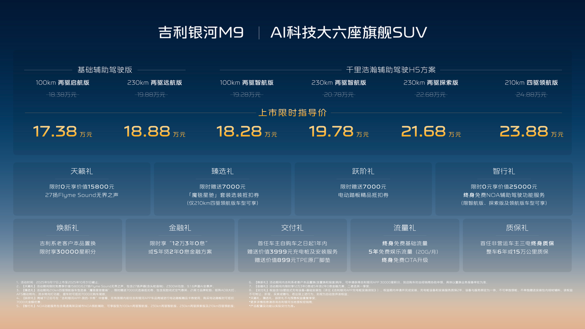 吉利银河M9共推出6款配置车型,分别为210km四驱领航版、230km两驱探索版、230km两驱智航版、100km两驱智航版、以及230km两驱远航版、100km两驱启航版,叠加限时超级置换金10000元权益后,上市限时指导价为17.38万元-23.88万元。