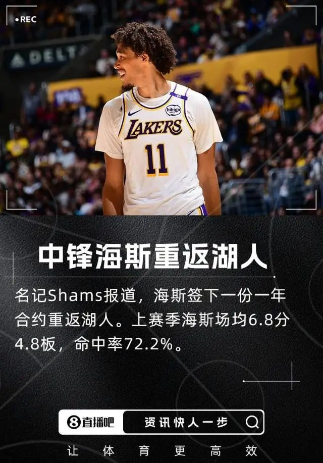 拥有勒布朗詹姆斯、卢卡东契奇的洛杉矶湖人队,也迎来一个新的操作,球队管理层通过一份一年三百三十万美元的底薪合同,续约替补中锋海斯,将他带回来搭档德安德烈艾顿,希望两者在新赛季,在内线有所作为,而不是被对手打爆。2024-2025赛季,效力洛杉矶湖人的海斯,出战五十六场常规赛,场均能够得到6.8分4.8篮板1助攻,季后赛出战一场,场均能够得到1.8分2篮板0.3助攻,他的回归,意料之中,毕竟没有自主得分能力,除了佩林卡,真没人要。