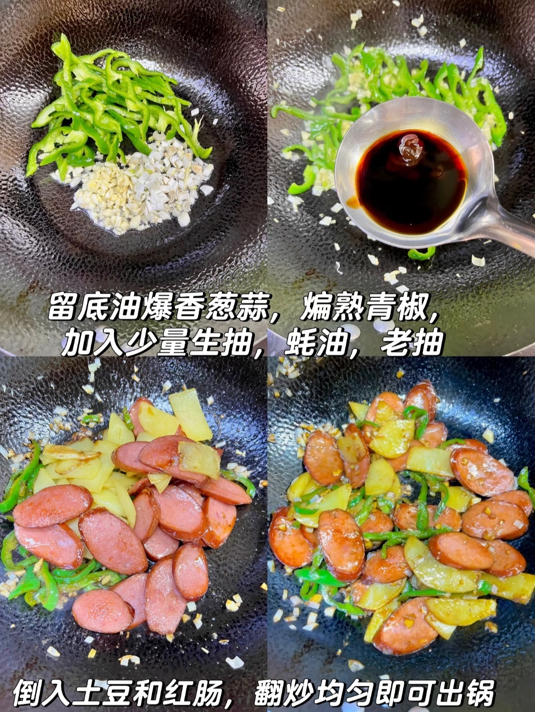 实在懒得洗两个锅?没问题!用不粘平底锅的话,可以先把土豆煎至半熟推到锅边,再煎红肠,最后推到另一边,中间空出来的地方爆香炒青椒。虽然效果略逊分煎,但胜在省事,味道依然能打!