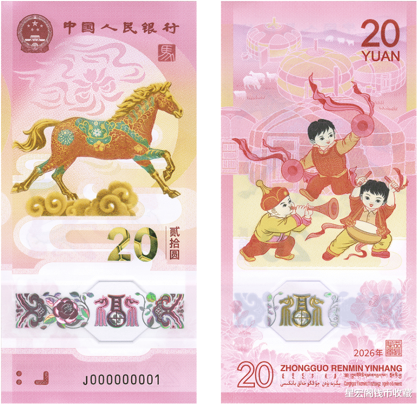 部分收藏爱好者认为2026年马年普通纪念币整体设计是非常不错,好于2026年马年纪念钞。不过说句实话,其实2026年马年纪念钞在没有发行之前听到过一些小道消息,我预想的会比较好看,但是看到发行公告当中2026年马年纪念钞样票的设计,确实还是有一些失望,并没有比较惊艳的设计出现,希望2026年马年纪念钞兑换以后实物效果会好一些。