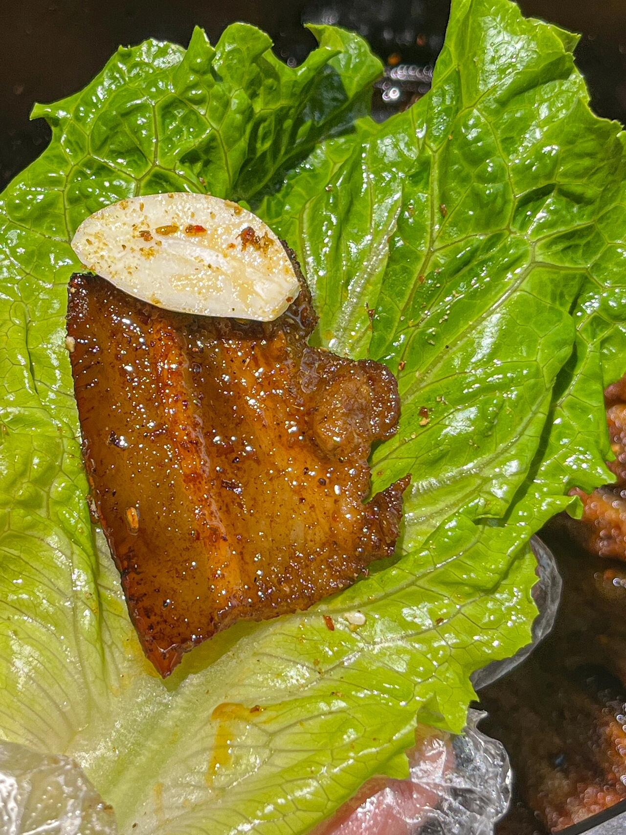 拿起一片生菜,放上一块烤好的五花肉,加一片烤蒜,再蘸点烧烤料,包起来一口塞进嘴里。生菜脆嫩清爽,正好中和了肉的油脂,吃起来一点不腻;五花肉外焦里嫩,肥的部分烤得酥脆,像在吃油渣,瘦的部分软嫩多汁,肉香在嘴里爆开;烤蒜软糯香甜,带着焦香,完全没有了生蒜的冲味;烧烤料的复合香气在嘴里散开,孜然、辣椒、芝麻的味道层层递进。那种满足感,和烤肉店里吃的一模一样,甚至更香——因为是自己做的,肉随便放,料随便加。