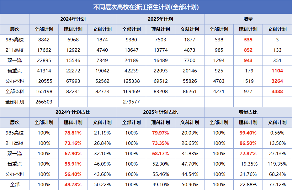 另一方面,从不同层次高校在浙招生计划看,学校层次越高,理科选科要求的招生计划占比越高,985高校层次,理科计划约是文科计划的4倍;211层次,理科计划约是文科计划的2.8倍,到了后面层次的院校,文理招生计划才接近1:1,所以理科生上名校的概率也远远大于文科。