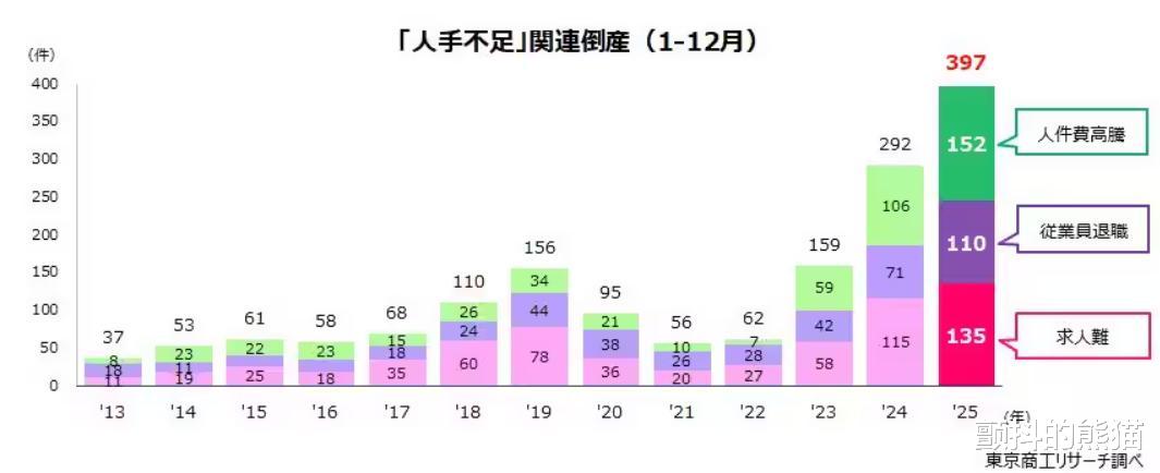 2025年的日本企业倒闭潮无疑是“异常状况”。因人手不足导致的破产达427起,创历史新高。其内在实质正从“招聘难”转向“员工流失”。过去日本是“招不到人”,但从2025年起,因“员工辞职”导致经营难以为继的案例急剧增加。
