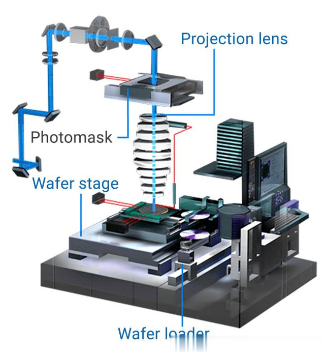 光刻机是半导体制造过程中最关键的设备之一,其基本结构包括光源系统、光路系统、掩模系统、投影物镜系统、工作台系统和控制系统等部分。光源系统产生高能量的光束,光路系统将光束引导到掩模上,掩模系统承载着需要转移的电路图案,投影物镜系统将掩模上的图案缩小并聚焦到硅晶圆上,工作台系统则负责精确控制硅晶圆的位置,控制系统协调各部分的工作,确保光刻过程的精确性。