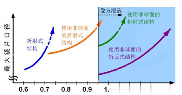 1)增大投影光刻物镜的数值孔径:一方面可以改进投影式透镜系统来增大入射角,另一方面可以采用折射率高的介质-浸润式。非球面的使用能够在不增加独立像差数的前提下,增加自变量的个数,有利于改善像质,同时在同等约束条件下,减少了光学元件的数量。非球面的应用使物镜NA可以增加到0.9,接近物理极限(干式光刻);引入浸没式技术后,物镜NA可以增加到1.1以上(浸没式光刻);加入反射镜组成折反式结构理论上物镜NA可到1.35 (极限值)。趋势为(干式)球面镜→非球面镜→(浸没式)非球面镜→折返式。