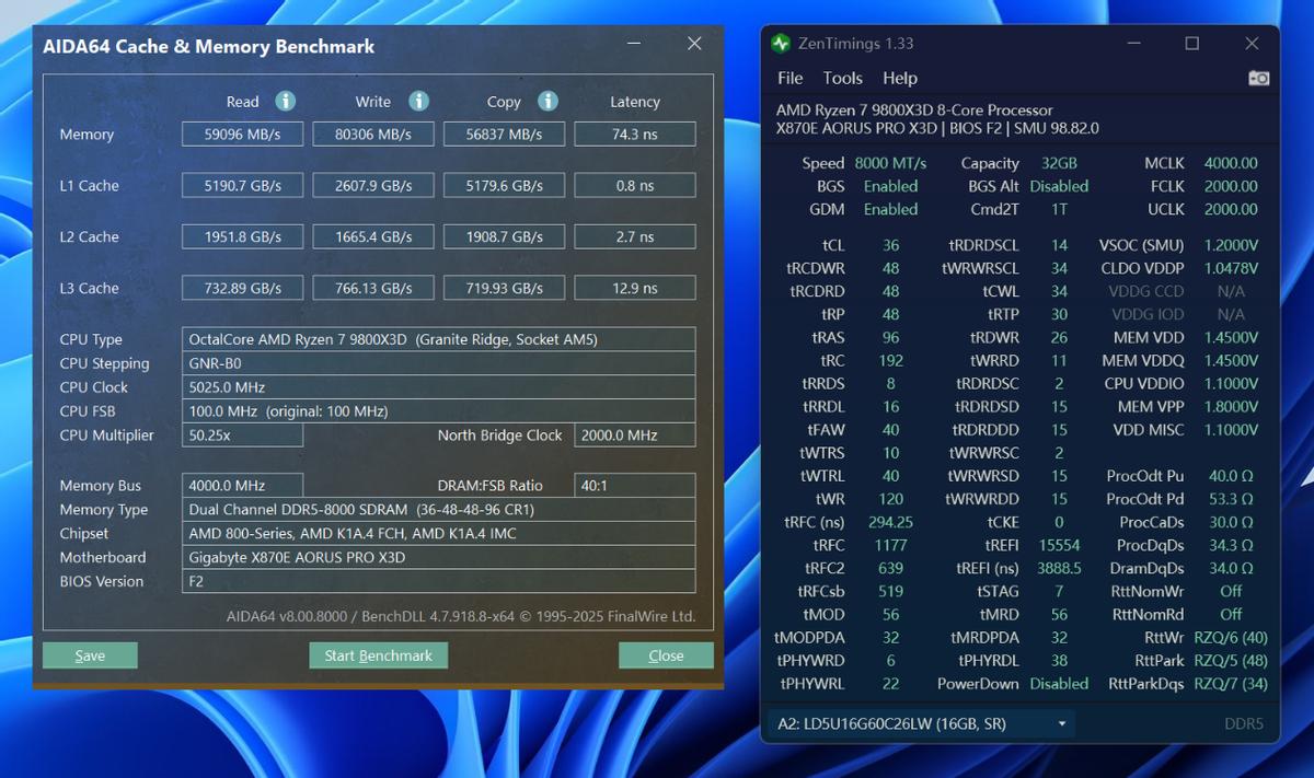 内存部分的表现同样扎实。主板标称支持最高9000MT/s频率,包装内附赠了独立内存散热风扇,官方宣称可降低10℃左右。实测中,一套C26时序的DDR5 6000MHz套条在默频下AIDA64延迟为98.5ns。通过AORUS AI SNATCH超频工具一键识别后,系统自动给出6200MHz优化预设,时序收紧至26-36-36-68,延迟降至70.6ns,读写速度均有明显提升。进一步的手动异步超频测试中,在1.45V电压下将同一套内存拉至8000MHz,时序36-48-48-96,成功进入系统并完成跑分,AIDA64延迟74.3ns。不过从实际游戏表现来看,同步6000MHz左右仍是AMD平台当前的最佳甜点区间,不建议普通用户刻意追求异步高频。