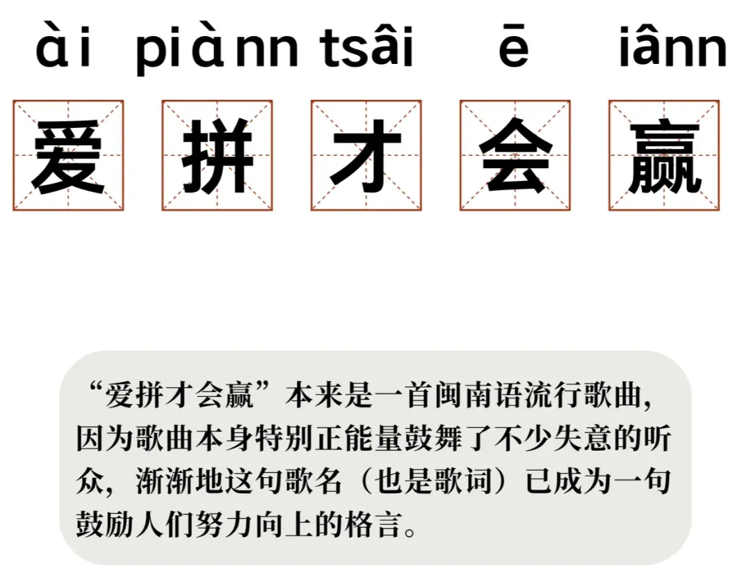 或许你不了解闽南人,但是你一定听过这样一句闽南语的歌词:“爱拼才会赢(ài-piànn-tsiah-ē-iânn)”。未见其人、先闻其声,爱拼敢赢的闽南精神,早于闽南人被大家认识之前,就在大家的嘴里口口传唱。