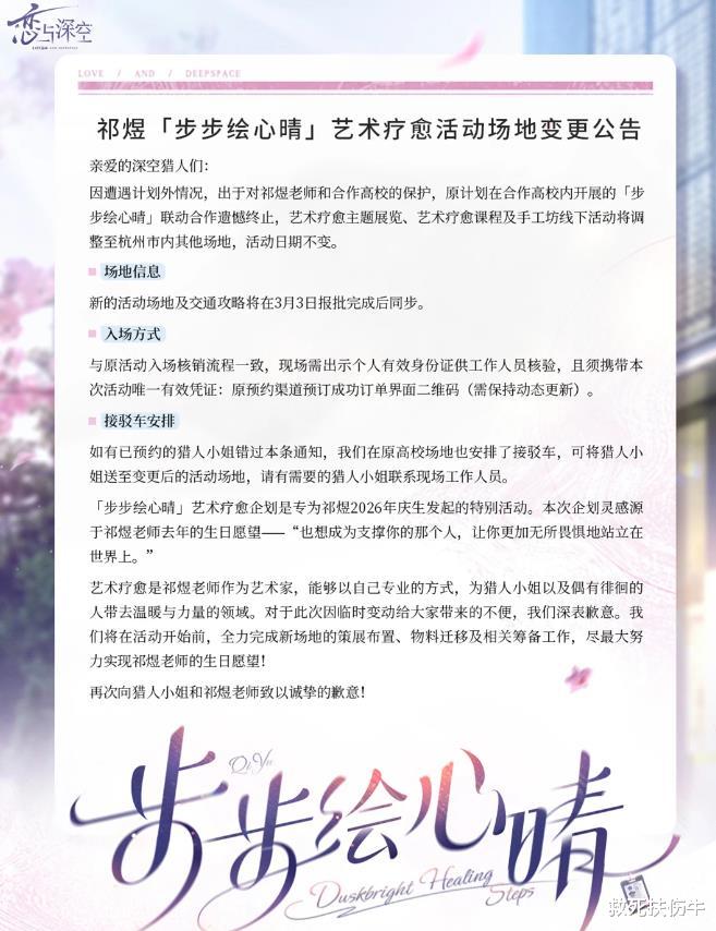 后续就是恋与深空官方发布公告,称“因遭遇计划外情况,出于对祁煜老师和合作高校的保护”,紧急更换了场地。