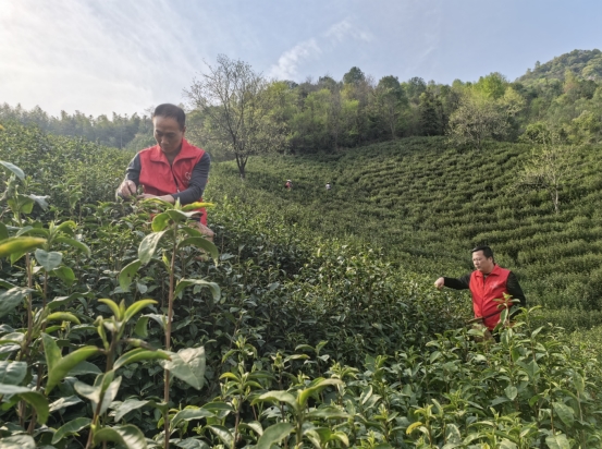 在茶农的现场指导下,大家快速掌握采茶要领:选取一芽一叶的优质鲜叶,用双指轻提芽茎,切忌用指甲掐断,保证茶叶完整美观。弯腰、提芽、入篓,志愿者们在反复操作中慢慢娴熟起来。红马甲的身影在翠绿茶垄间穿梭,指尖轻舞间,一片片鲜嫩芽叶落入竹篓。田间地头,志愿者们不惧日晒腰酸,用最快速度抢收春茶,切实缓解茶农采收压力。