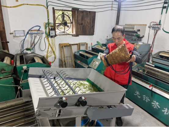 摊青是制茶的首道关键工序。志愿者们手持竹篮,将刚采摘的鲜叶均匀投入摊青机,机器内的拨料齿缓缓转动,把鲜叶平铺舒展,配合下方送风系统持续通风,让鲜叶在阴凉通风环境中缓慢失水、软化叶片,为后续加工奠定基础。