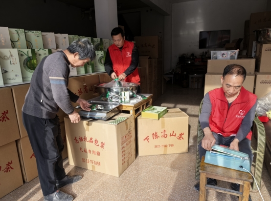 制茶完成后,志愿者们转战包装区,协助茶农开展茶叶打包工作,为春茶上市“美颜增色”。