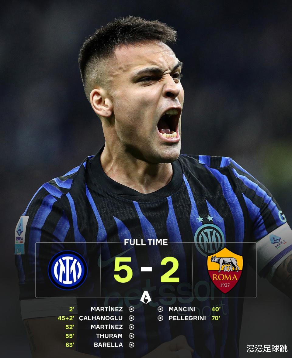 第63分钟,罗马后防连续失误,巴雷拉轻松推射得手。短短12分钟,国米连进3球,国米5-1,比赛彻底失去悬念。