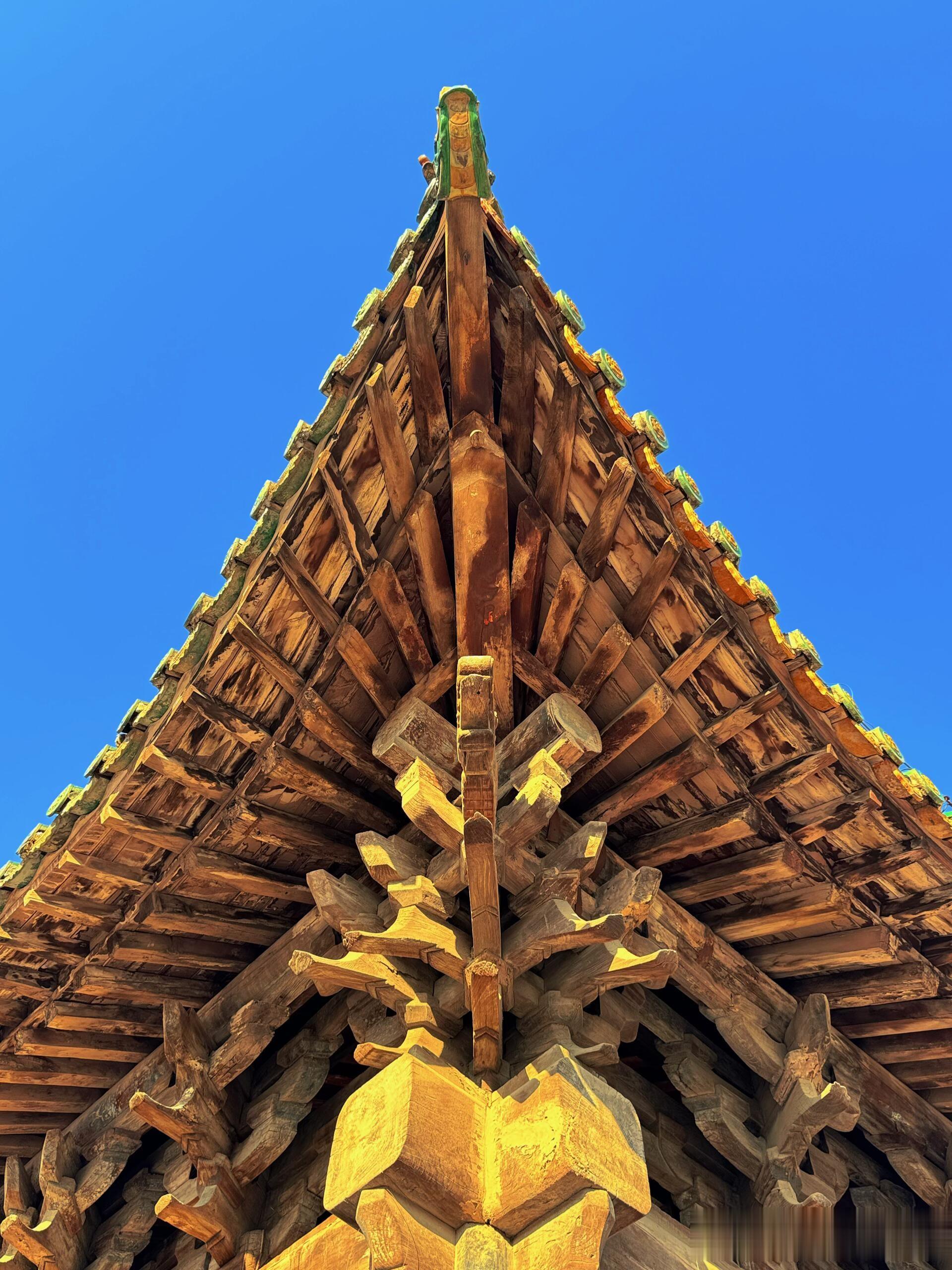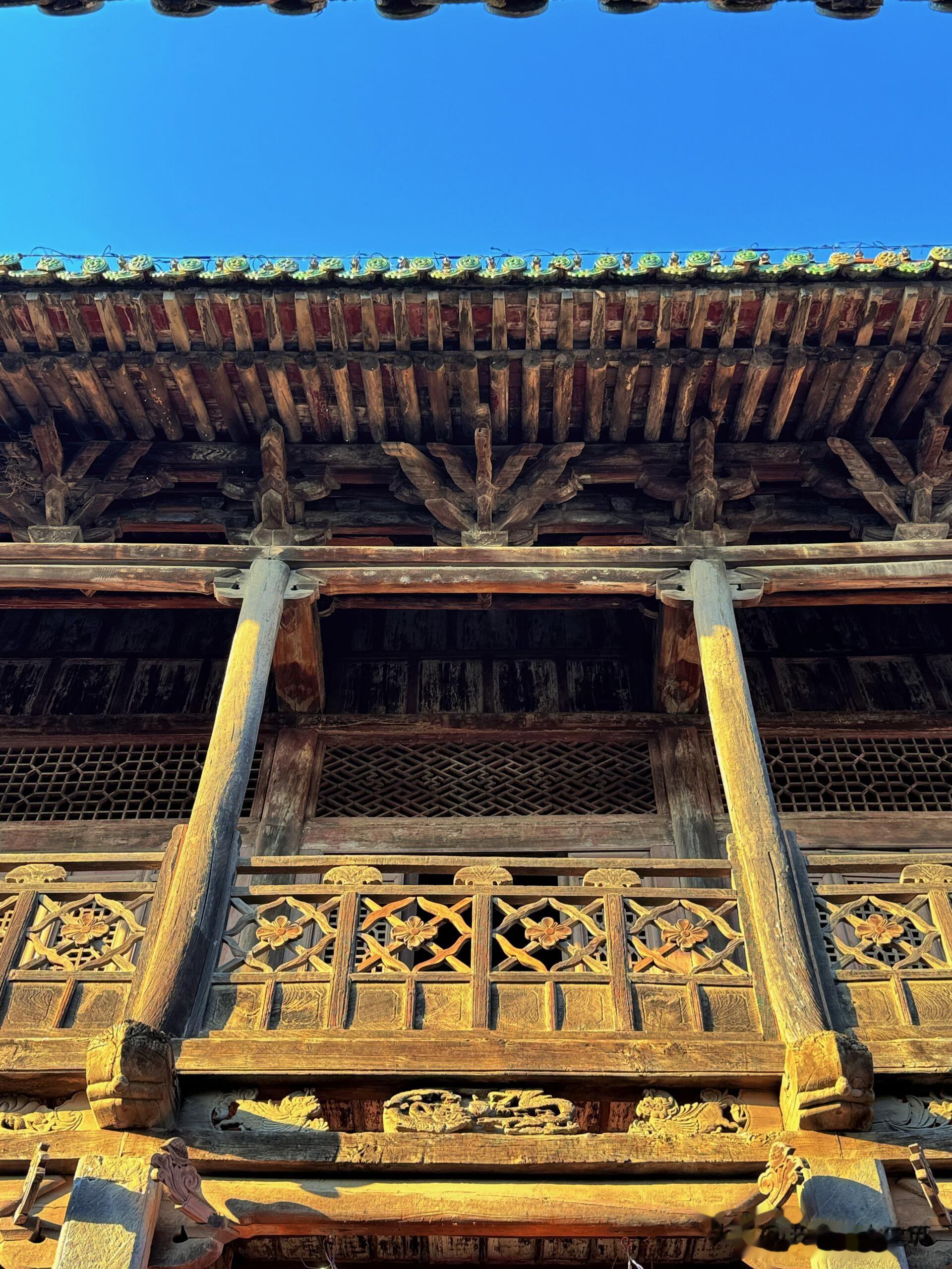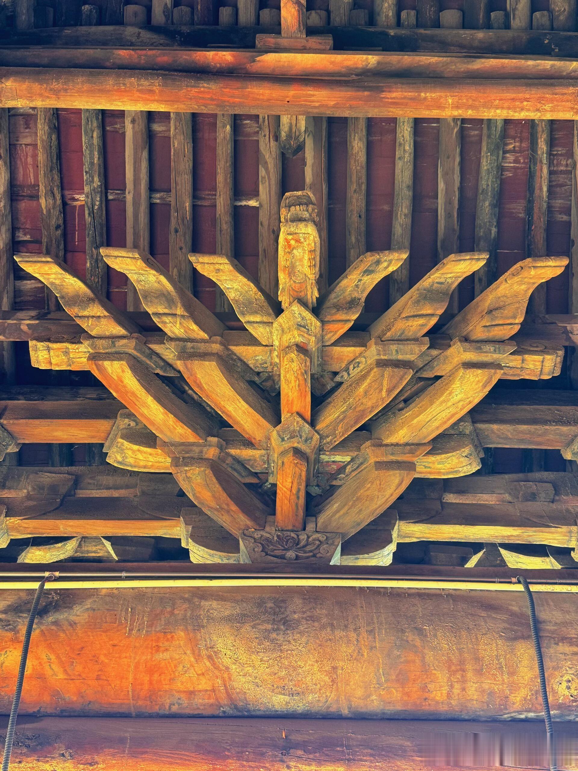 与北京明清藻井的雍容华贵不同,这方藻井最动人的特质是“素面朝天”的质朴。它不依赖繁复的彩绘,也没有鎏金的点缀,完全以原木的天然肌理与层叠结构取胜。木材历经四百余年风霜,早已褪去新木的青涩,呈现出温润的深褐色,纹理在光线下清晰可见,每一道纹路都是岁月的印记,每一块木材都在诉说着故事。这种简约而不简单的审美,正是晋东南明代小木作的精髓——匠人相信,真正的美无需过多修饰,结构本身的逻辑与木材的天然之美,便是最高级的装饰。触摸殿内的木柱,能感受到木材的温润质感,抬头仰望藻井,仿佛能与当年的匠人对话,体会他们对材料的敬畏、对工艺的执着。