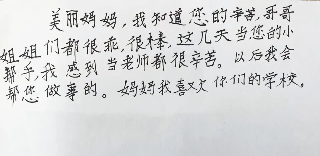 许雁老师的儿子表达了类似的心声,正如他在手写卡片中表达的:“这几天当您的小帮手,我感到当老师都很辛苦。以后我会帮您做事的,妈妈我喜欢你们的学校。”稚嫩的话语中满含对父母的理解与关爱,真挚的情感在亲子间静静流淌,让这个秋日格外动人。