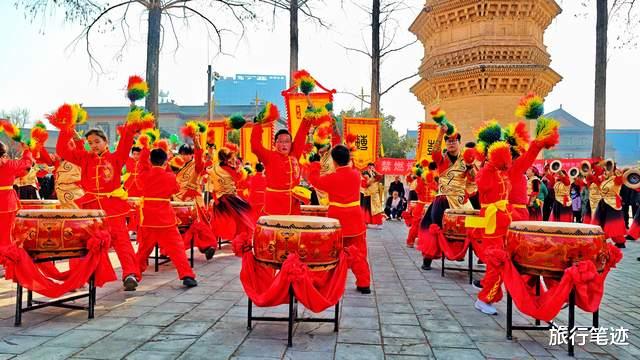 广场上鼓手们身着彩衣,围着大鼓旋转敲击,钹手在人群中穿梭配合,全场皆转,气势磅礴。岐山转鼓民间称之为“跑鼓”,古时用于祭祀、战阵助威。