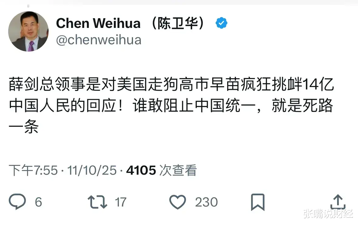 “斩首”说继续引爆,这回合出手的是中国日报欧盟分社社长陈卫华,“薛剑总领事是对美国走狗高市早苗疯狂挑衅14亿中国人民的回应!谁敢阻止中国统一,就是死路一条”。