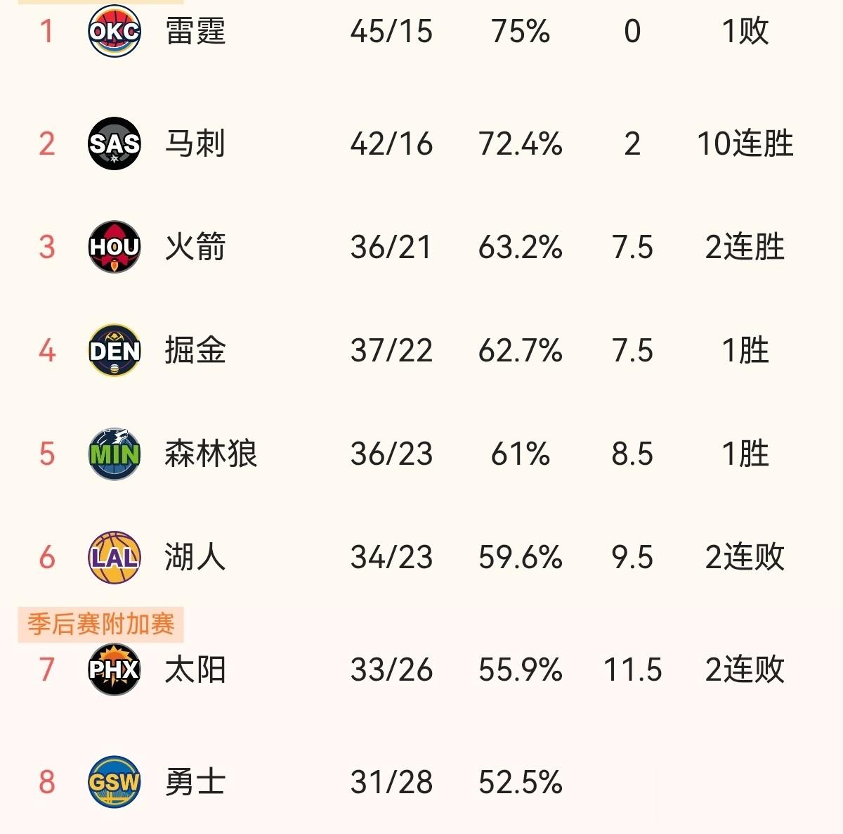 勇士稳坐第八,太阳面临危机。勇士今天大胜灰熊,31胜28负稳居西部第八。而太阳则遭遇两连败,33胜26负虽然排名第七,但与身后勇士的差距正在缩小。常规赛还剩20场左右,西部排名榜的悬念才刚刚开始。是马刺后来居上?还是雷霆稳住阵脚?附加赛区的混战谁能突围?让我们拭目以待。
