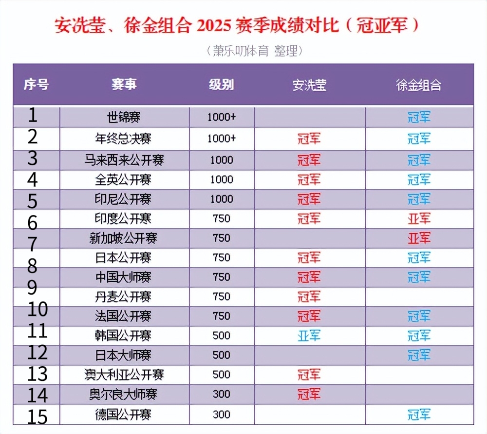 2025赛季结束了,最大的赢家到底是谁,大多数网友可能会说是安冼莹,但小编觉得,比起下面这对组合,安洗莹还是要稍逊一筹。两对球员的成绩如下(冠亚军):