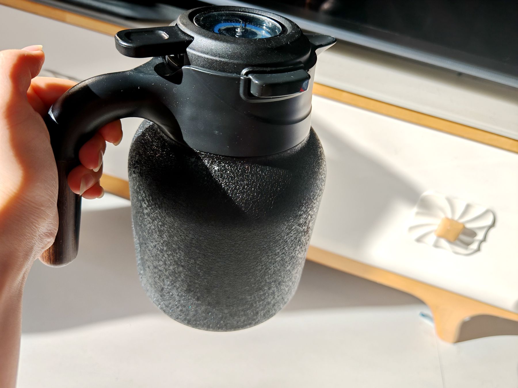 当我收到这款保温壶的第一眼就很喜欢,黑色款壶身采用简约流畅设计,无多余装饰,仅以烫金花印logo点缀,低调中透着沉稳质感,适配各种家装风格,看上去特别高端大气。