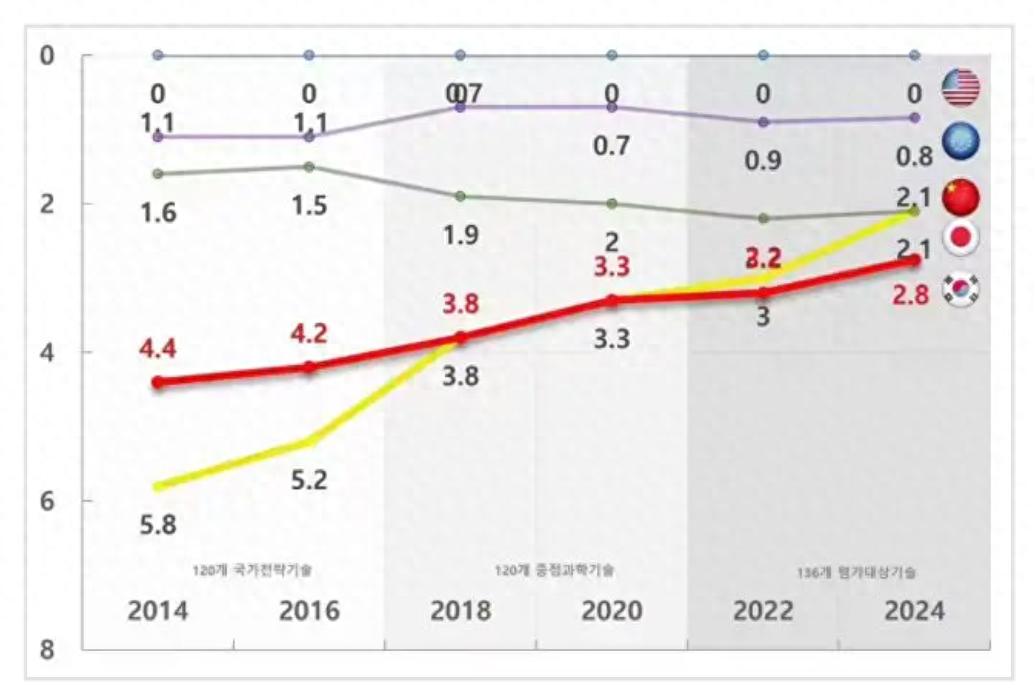 近日,被称之为“韩国智库”的韩国科学技术信息通信部今日,提交了一份2024年技术水平评估结果,上面显示了全球五大经济体(