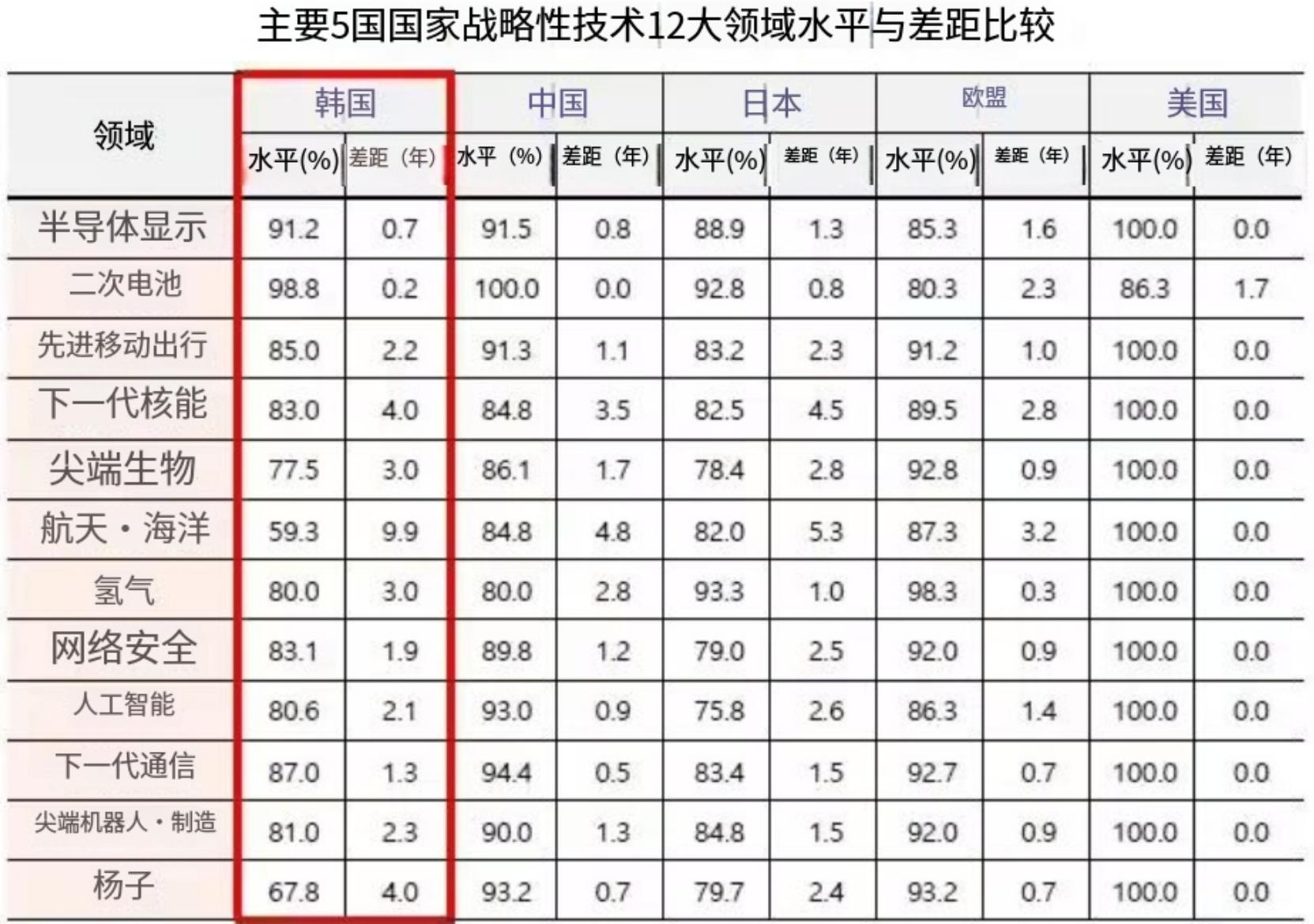 近日,被称之为“韩国智库”的韩国科学技术信息通信部今日,提交了一份2024年技术水平评估结果,上面显示了全球五大经济体(美国、中国、欧盟、日本、韩国)之间的科技水平对比。